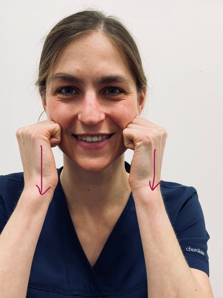 Złóż dłonie w pięści i kłykciami wykonaj wolny, posuwisty ruch w dół, wzdłuż policzka; użyj lekkiego nacisku, pamiętając o tym, by górne i dolne zęby nie stykały się ze sobą w tym czasie.